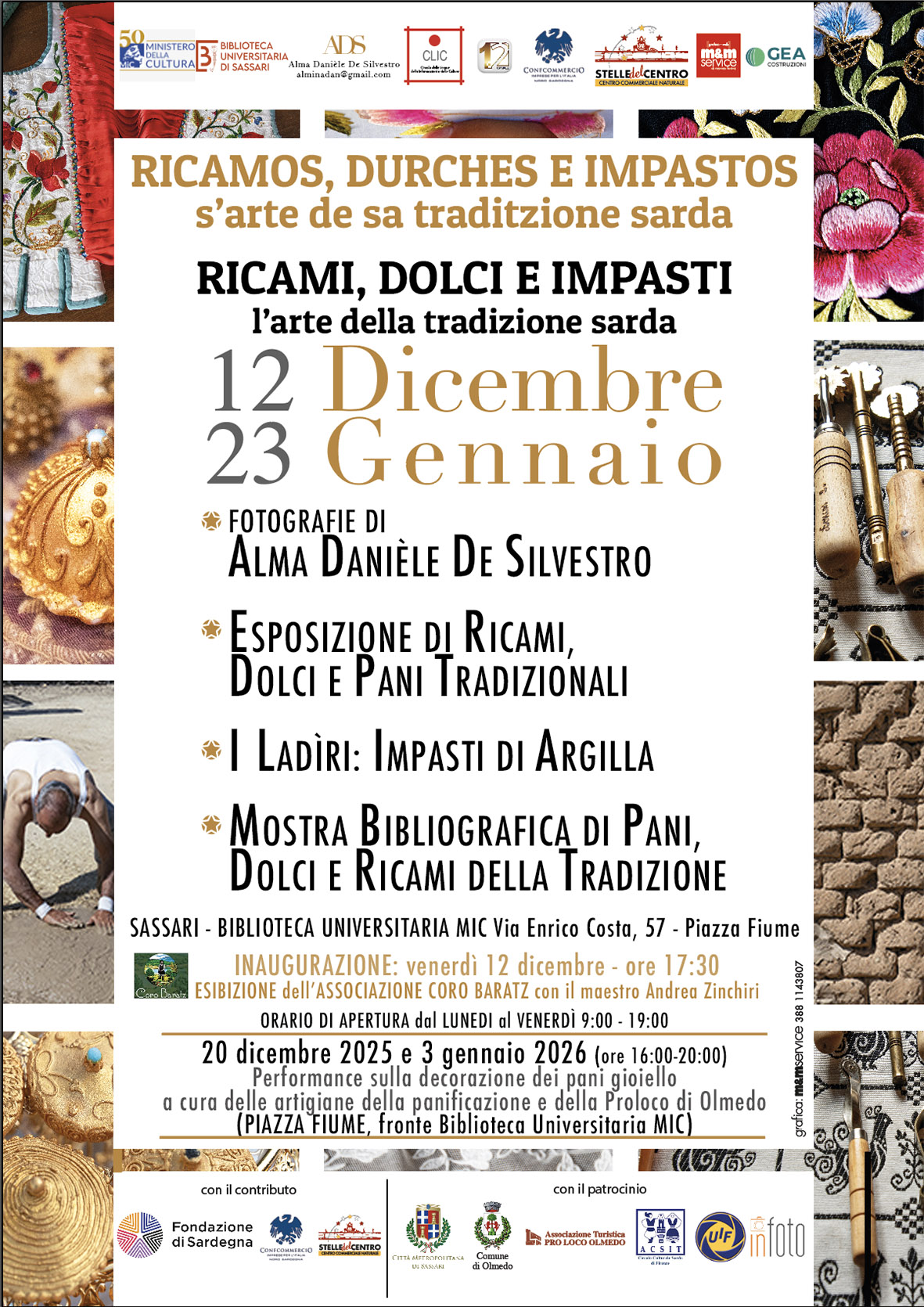 Ricami, dolci e impasti della tradizione sarda si fondono nelle immagini della fotografa Alma Danièle De Silvestro. L’originale allestimento della mostra Ricamos, durches e impastos: s’arte de sa traditzione sarda mette in relazione le immagini con i pani e i dolci, i ricami nei tessuti preziosi, gli impasti di semole e di argille, e troverà spazio nelle sale della Biblioteca Universitaria del MiC in piazza Fiume a Sassari, dal 12 dicembre al 23 gennaio, con orario continuato 9-19 dal lunedì al venerdì.