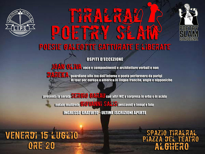 Si inizia venerdì 15 luglio alle 20 ad Alghero, con il primo “Tiralral Poetry Slam” ospitato all’interno dello spazio artistico Tiralral (piazza del Teatro) a cura della sezione sarda della LIPS (Lega Italiana Poetry Slam), in collaborazione con l’associazione “La bête aveugle”; presenta e anima la sfida Sergio Garau coadiuvato da altri MC (master of ceremony, coloro che animano e gestiscono lo svolgimento della “gara”) a sorpresa; ospiti speciali d’eccezione il padrone di casa Giuàn Oliva che presterà voce e componimenti e architetture verbali e non, e il poeta Dareka (Marc Vanicatte), performero di spessore internazionale da Parigi in tour per Europa e America con poesie in francese, inglese e giapponese; ingresso gratuito.