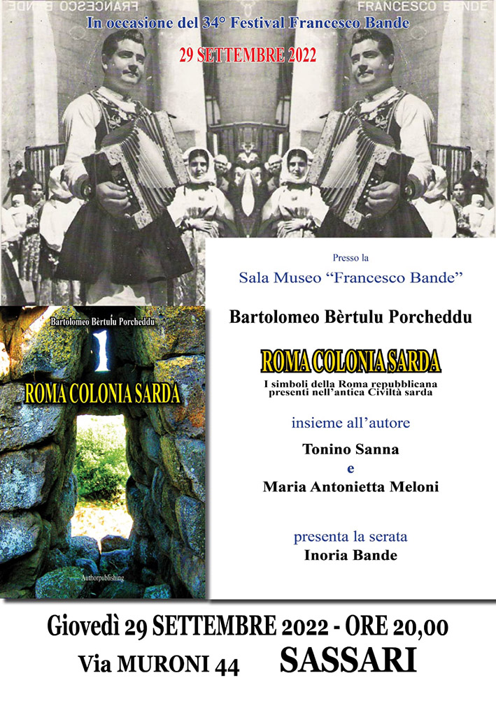 Sassari. Giovedì 29 settembre alle 20, nella sala conferenze del Museo Etnografico “Francesco Bande” in via Muroni 44 a Sassari, in occasione della 34ª edizione del Festival Bande, lo studioso Bartolomeo Porcheddu presenterà “Roma colonia sarda”, un libro dedicato ai simboli della Roma repubblicana già presenti nell’antica civiltà sarda. Interverranno, oltre all’autore, Tonino Sanna e Maria Antonietta Meloni.