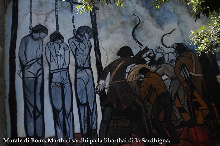 Pa tutti chisthi patrioti, fuittaddi, la tinaglia atzesa a foggu, lu cannau impriasthaddu a saboni, tandu l’impiccu, e l’isthrada pa ischabitzalli da morthi. Lu cori isthratzaddu da la pittorra. Li cabbi drentu a un saccu e carraddi in prisgioni. La dì fattu fichiddi i’ lu trabi di lu patiburu a Potzu di Rena. Erani ottu patrioti sassaresi. Althri so ‘sthaddi cundannaddi a rimà tutta la vidda i’ li gareri. Althri ancora, pa furthuna d’eddi, si desini a la latitantzia dibintendi “bandiddi”.