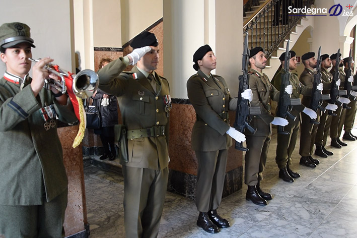 Schierato il picchetto d’onore del 152° Reggimento fanteria “Sassari” e due sassarini in uniforme storica, che hanno deposto la corona d’alloro ai piedi della lapide. Il luogotenente Antonio Pinna ha dato lettura della motivazione per il conferimento del riconoscimento. Nel cortile interno, la banda musicale della Brigata in uniforme storica ha eseguito gli inni. Alla cerimonia, tra le altre autorità, hanno partecipato anche il presidente del Consiglio regionale Gianfranco Ganau, il vice prefetto Salvatore Serra e il questore Maurizio Ficarra.