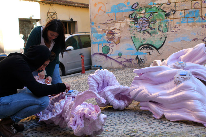 Il materiale. Negli spazi del laboratorio di Scultura del Liceo artistico in piazza d’Armi, tra un inebetito ritratto di Homer Simpson e una serie di stralunati pupazzi in gommapiuma, spunta un grande frammento in poliuretano, testimonianza di una visita di qualche anno fa alla ISOLEX – isolanti italiani di Porto Torres. La laminatrice dell’azienda produce a ciclo continuo perfetti pannelli rettangolari per la coibentazione edilizia ma, di tanto in tanto, la macchina si inceppa e fuoriescono nastri rigonfi, contorti, deformi. Se questi rappresentano un fastidioso scarto per l’azienda, per i giovani scultori sono una straordinaria opportunità: agli occhi di chi crea sono detriti galattici, magma congelato proveniente dall’infinito cosmico. Così questi avanzi diventano bizzarri frammenti della stella cometa, caduti sulla terra durante il suo passaggio.