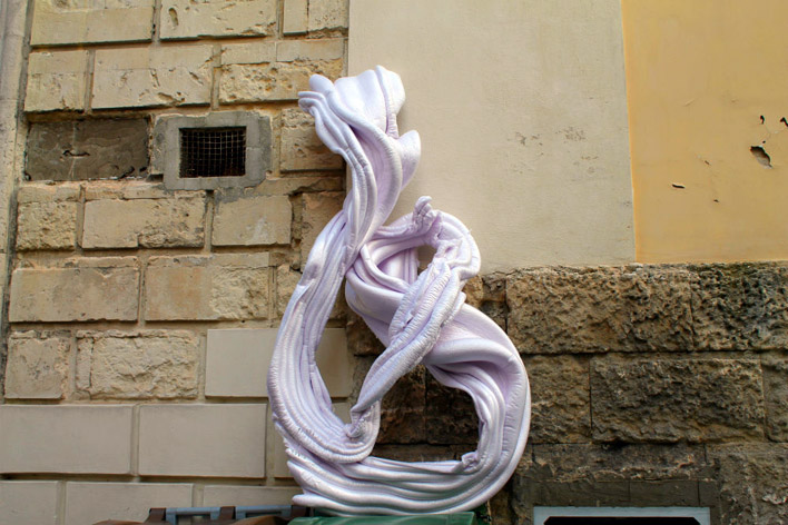 “Soffio”. “Soffio” è ispirato alla scia della stella cometa e ai suoi frammenti lasciati cadere durante il passaggio. I “frammenti” che costituiscono l’opera sono in poliuretano espanso, offerto dall’azienda produttrice di Porto Torres ISOLEX. Le scie che guideranno i cittadini tra le vie del centro, tutte da scoprire, sono create con materiali di recupero, segno ancora una volta dell’intenzione dell’Amministrazione di puntare su un “Natale sostenibile”. Gli alunni del corso di Scultura hanno così risposto all’invito dell’assessora alla Cultura del Comune, Monica Spanedda, affinché anche il Liceo artistico portasse un suo contributo alla città per le celebrazioni natalizie. Coordinati dai professori Iaria, Pirozzolo, Pisano, si sono rimboccati le maniche e hanno cominciato a tagliare, incollare, ricomporre i pezzi, così che, una volta trasformati in sorprendenti sculture, come con un lieve soffio, dal cortile della scuola, si sono levati in cielo a volteggiare lievi lungo le vie della città. Utilizzando il materiale di scarto della fabbrica, gli studenti di piazza d’Armi hanno scelto di riportare la cometa a qualcosa di enigmatico, di imperfetto, di non concluso. Non una risposta, dunque, ma una domanda posta allo spettatore. Non c’è una spiegazione, i segni richiedono un’interpretazione soggettiva.