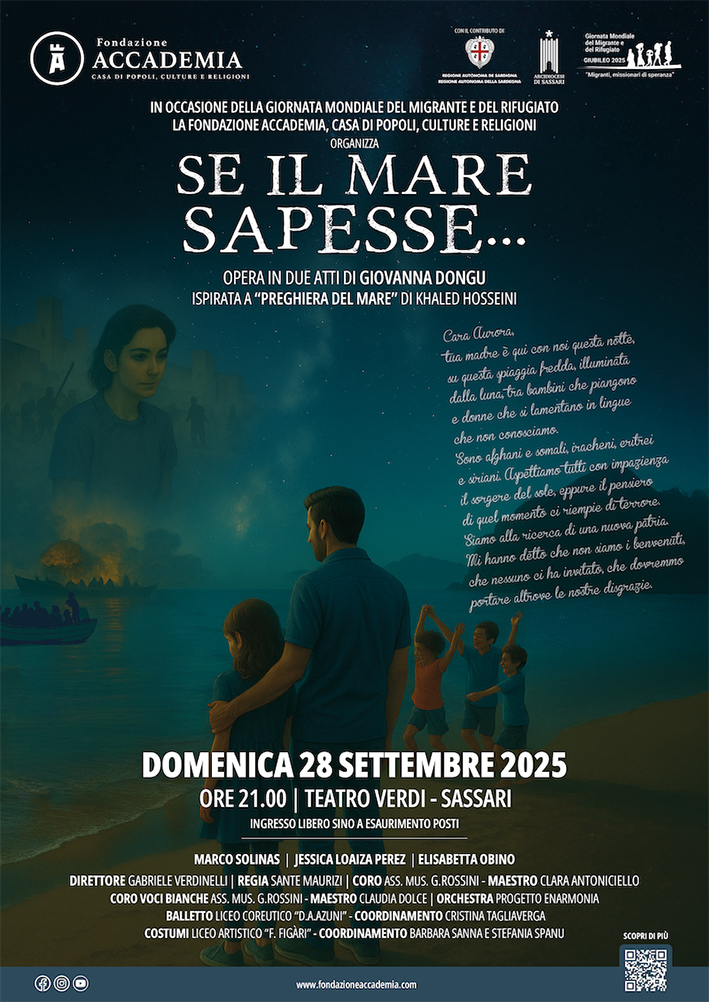 La Fondazione Accademia Casa di Popoli, Culture e Religioni, in collaborazione con l’Arcidiocesi di Sassari e con il contributo della Regione Autonoma della Sardegna, presenta Se il mare sapesse…, opera in due atti di Giovanna Dongu ispirata a Preghiera del mare di Khaled Hosseini. L’appuntamento è per stasera (domenica 28 settembre) alle 21 al Teatro Verdi di Sassari e si inserisce tra le iniziative per la 111ª Giornata Mondiale del Migrante e del Rifugiato. Sul palcoscenico Marco Solinas (baritono), Jessica Loaiza Perez (soprano) ed Elisabetta Obino. L’orchestra del Progetto Enarmonia sarà diretta da Gabriele Verdinelli. La regia è curata da Sante Maurizi. Con il coro dell’Associazione Rossini, diretto da Clara Antoniciello, insieme al coro di Voci Bianche della Rossini diretto da Claudia Dolce, il balletto del Liceo Coreutico “Azuni, con il coordinamento di Cristina Tagliaverga, e i costumi del Liceo Artistico “Figàri”, con il coordinamento di Barbara Sanna e Stefania Spanu.