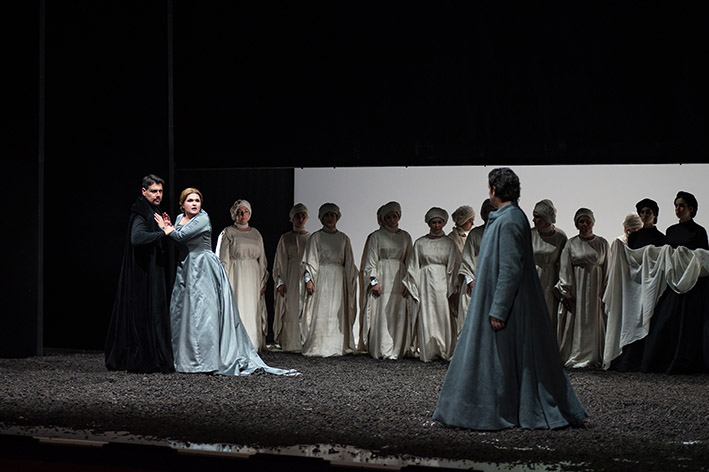 Tutto bene allora per la rappresentazione sassarese del capolavoro verdiano, libretto di Salvadore Cammarano, tratto dal “Trovador” di Antonio Garcia Gutierrez? Sì, bisogna ammetterlo. Si è trattato di un allestimento che ha convinto sotto tutti i punti di vista. A cominciare dalla regia. E possiamo dirlo almeno stavolta: finalmente una vera regia, moderna ma antica al tempo stesso, senza stravolgimenti e con soluzioni scenografiche di grande intelligenza. A cominciare dalla falsa quinta, solo disegnata, con le linee di fuga che ricordavano certi disegni visti al liceo sui manuali di storia dell’arte. Fondali che richiamavano capolavori dei maestri italiani ma anche i progetti degli architetti di oggi. Tutto all’insegna del bianco e del nero, grande luce (l’amore tra Leonora e Manrico) e tenebre più oscure che mai (l’odio di Azucena e la negatività del Conte), per non parlare della cenere, a memoria del rogo in cui morirono la madre e il figlio della zingara, presente in diverse scene e nel finale d’opera, quando la cenere stessa cala sul Conte a suggellare il tratto negativo del personaggio ma anche la vendetta di Azucena. Tutte soluzioni pensate e realizzate dal giovane regista siciliano Roberto Catalano, insieme allo scenografo Emanuele Sinisi, alla costumista Ilaria Ariemme e a Fiammetta Baldiserri al disegno luci.