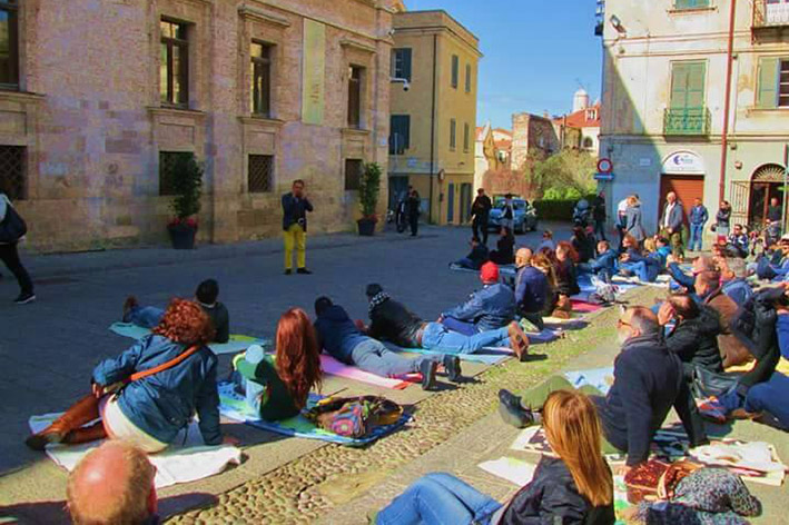 Sassari. Flash mob dedicato a Platamona sabato mattina in piazza del Comune. «Abbiamo organizzato una manifestazione pacifica per sollecitare la politica cittadina ad una maggiore attenzione e salvaguardia della rotonda di Platamona e di tutto il litorale», spiega il promotore Antonello Unida. Sotto Palazzo Ducale sono stati così sistemati degli asciugamani. «Ci siamo sdraiati per un minuto in silenzio per “commemorare” la scomparsa dell’integrità della rotonda di Platamona. Abbiamo poi riposto gli asciugamani lasciandoli davanti al portone di ingresso del Comune». Circa 70 coloro che hanno partecipato al flash mob. Gli asciugamani sono stati raccolti e donati al canile di Campanedda.