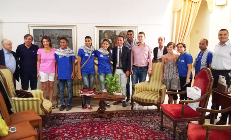 A dare il benvenuto agli atleti è stato il presidente del Consiglio comunale Antonio Piu che ha voluto ricordare il già positivo incontro dello scorso anno, con una precedente delegazione. «Si tratta – ha detto – di una occasione positiva che consentirà sia a loro sia ai nostri giovani di fare una valida esperienza di integrazione». Lavinia Rosa di “Ponti non Muri” ha ribadito il concetto e ha ricordato gli impegni dell’associazione, nata nel 2007 e che attraverso le sue attività si occupa di far conoscere la drammatica realtà che si vive in Palestrina. Negli anni sono stati attivati due progetti specifici: il primo a sostegno dell’orfanotrofio “La Crèche di Betlemme” e il secondo a sostegno della squadra mista di atletica leggera “Nadi Shabab Ariha” di Gerico.