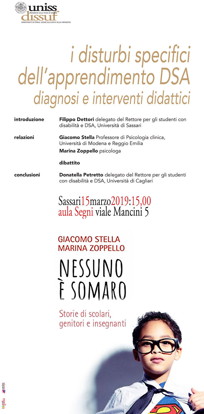 Alla prima conferenza prenderanno parte Giacomo Stella, professore di Psicologia clinica all’Università di Modena e Reggio Emilia, Donatella Petretto, delegata del Rettore per gli studenti disabili e con DSA dell’Università di Cagliari, e Marina Zoppello, psicologa. A partire dal libro “Nessuno è somaro: storie di scolari, genitori e insegnanti” (di Stella e Zoppello), verranno illustrate le caratteristiche dei disturbi specifici dell’apprendimento e gli strumenti didattici con cui un docente può favorire il successo formativo.