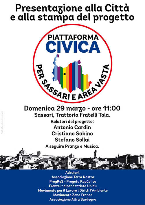 Domenica 29 marzo alle ore 11 presso la Trattoria Fratelli Tola in piazza Tola verrà pertanto presentato a Sassari il progetto Piattaforma Civica alla stampa e alla cittadinanza in una conferenza stampa / assemblea pubblica nel corso della quale i portavoce esporranno le ragioni politiche e i metodi che ne stanno a fondamento. Interverranno i relatori Antonio Cardin, Cristiano Sabino e Stefano Sollai. A seguire pranzo e musica.