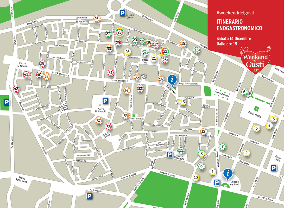 All’interno di ciascun itinerario – rosso, arancione, giallo e verde – ognuno potrà scegliere liberamente la sequenza delle tappe. Gli esercizi che hanno aderito sono Sapori e Tradizioni, Menomale che c’è mamma, Vineria Tola, Pizzeria Cocco, Frutta e Verdura dal Mango, Briciola, Panetteria di Rebecca, Bar pasticceria al Duomo, Raggio d’oro, Circolo Gli incredibili, Melamangio, La Divinoteca, Caffè Vittorio Emanuele II, Family Affair, Bar 1.0, Caffé Accademia, Mangio da Nonna, Quod & F.lli Tola, Trattoria Le Due Lanterne, T.D. Lemon, La Bottega, Vineria Tola Bar Leone, Opificio del Tentenna, Panefratteria, Bidda Bar, Caffè Quattropuntozero, Gelateria Tondini, Caffè 1903, Benevà Beer&Burger, Coffee Break, Gusta Vinho’s, Pizzeria da Giò, Antica Caffetteria Trinità, Terzo tempo, Circolo ristretto, Bar del corso, BirrAjò, Bar Ducale, Cafè & Cake e Bar 155.