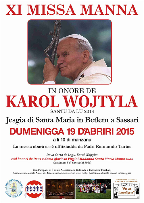 La celebrazione sarà un omaggio a Karol Wojtyla per gli insegnamenti di rispetto e di verità datoci e, nel contempo, l’esercizio modesto, ma sobrio, della sua Parola, la quale curava particolare attenzione alle minoranze etniche e linguistiche. L’impegno degli organizzatori vuole essere, quindi, un umile germoglio per una Chiesa sensibile e aperta alla sardità culturale volta all’affermazione della lingua sarda nella liturgia, quale mezzo di comunicazione moderna. Sicuri di aderire a quella stima che San Giovanni Paolo II in vari momenti del suo epocale papato manifestava, come ad esempio: «[…] nella lingua, si racchiude un particolare tratto dell’identità di un popolo e di una nazione. E, in un certo senso, in essa batte il cuore di questa nazione, perché nella lingua, nella propria lingua, si esprime ciò di cui vive l’anima umana nella comunità di una famiglia, della nazione, della storia» (Tokio, 1981). L’annuncio di una coscienza cristiana moderna non era rivolta soltanto al Giappone, ma a tutti i popoli della terra. Il 18 ottobre 1985 ad Oristano, il futuro santo, durante la visita in Sardegna, dopo aver ricordato la grandiosità del Giudicato d’Arborea, la sua regina Eleonora e la Carta de Logu, rammentò in sardo la dedica posta sull’antico codice giuridico: «Ad onori de Deus, Onnipotente, et de sa Gloriosa Virgini Santa Maria Mama Sua». Il giorno seguente a Nuoro esprimeva la necessità di veicolare in sardo: «Vorrei conoscere meglio la vostra lingua sarda per potermi sintonizzare anche verbalmente con le vostre voci, ed invocare da Dio con tutta la passione dell’animo il dono di quella civiltà dell’amore, di cui il mondo sente oggi l’urgente bisogno».